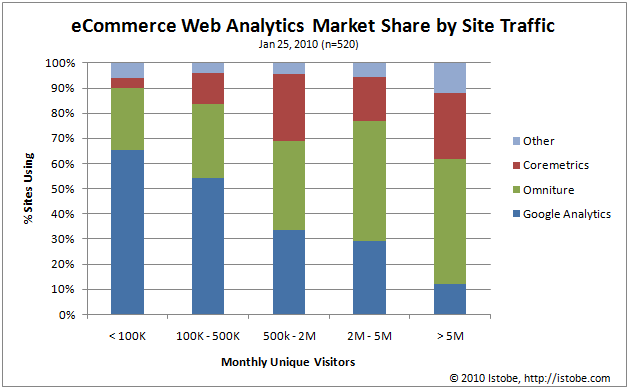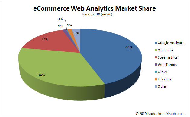 今天看到新闻,其实也很爆炸性,即IBM收购了CoreMetrics。CoreMetrics这家公司在美洲有不少的客户,是除了Omniture之外,主要的电子商务网站分析的提供商之一(可惜我还没有机会使用这个工具,我的博客www.chinawebanalytics.cn也很少谈到这个工具)。在目前世界上转化率最高的十家e-retail网站中,有八家用了Omniture,有一家用了CoreMetrics。下图是今年1月份istobe做出的关于电子商务网站所使用的网站分析工具的市场份额。