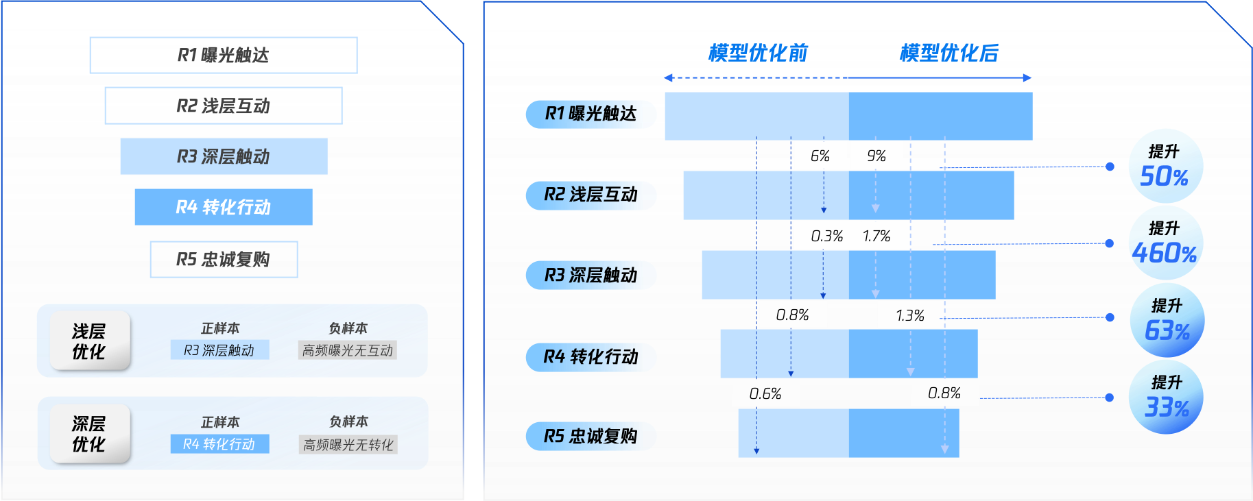 通过下图右侧的实际投放效果可以看到,对比模型优化前后,R1到R3的转化率提高了460%、R1到R4的转化率提高了63%,两项提升最为巨大的指标都与广告主诉求吻合。印证了RACE模型能根据品牌的营销目标,进而针对性进行建模为投放提效,帮助广告主实现“指哪打哪”的能力。