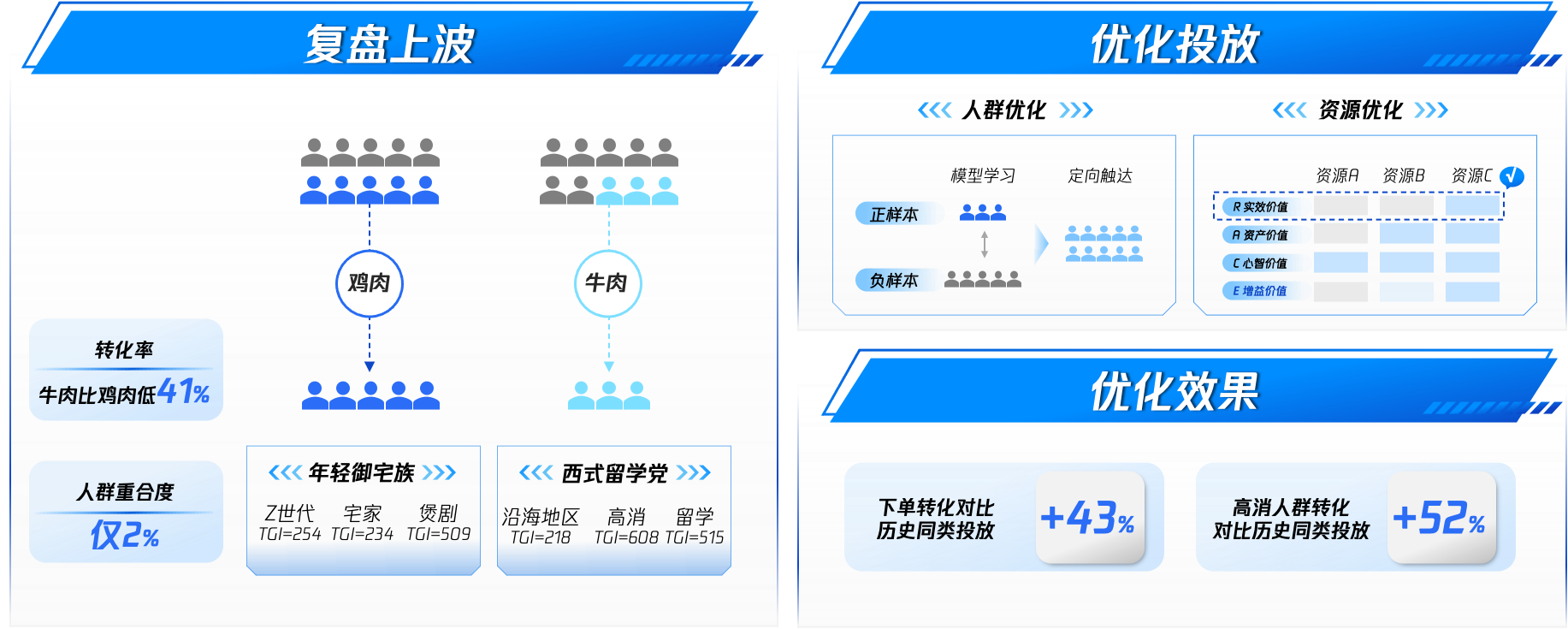 在这个案例中,优化后牛肉线的广告下单转化对比历史同类投放增加了43%,高消费人群的转化更比历史同类投放增加52%。