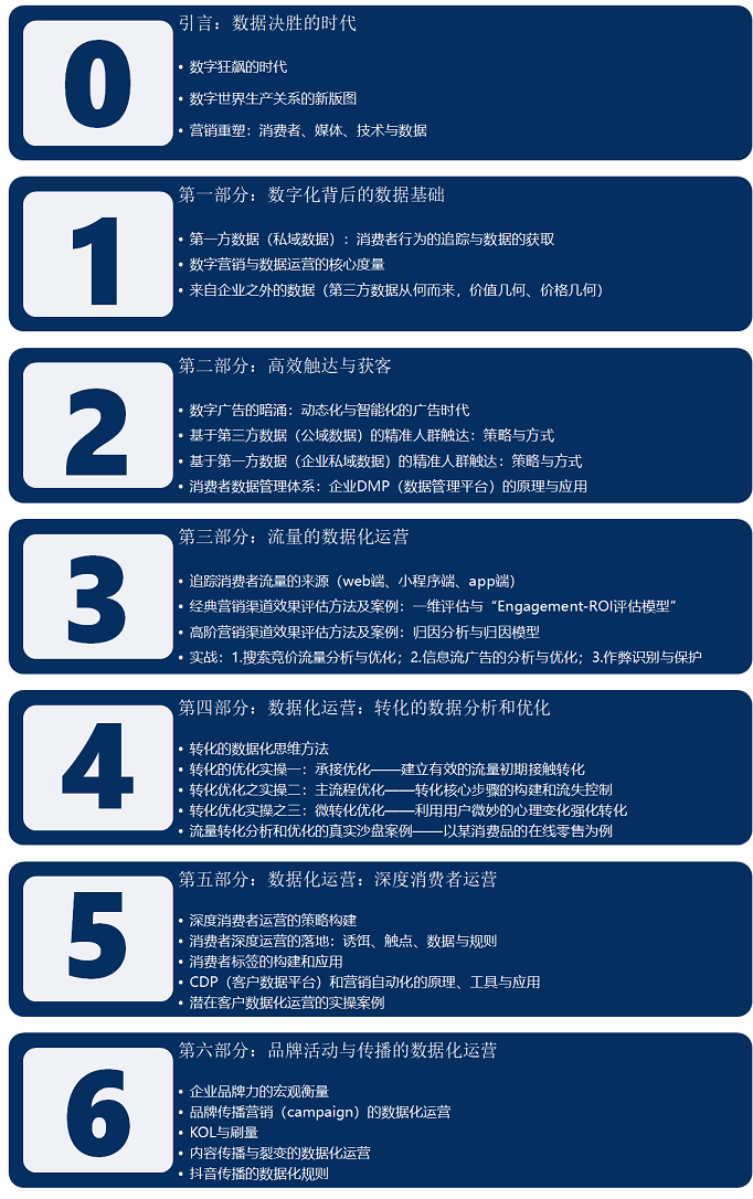 课程吸收了前16期同学们的诸多反馈,最新的这次升级,内容会更加聚焦于大家最关心的内容:数据与其应用场景的结合、数据对效果的优化、数据在营销和运营上深入的应用,更多的实操以及当前行业主流的发展热点与趋势。全部内容共7个大部分,29个子部分。超过65个知识点,以及超过20个有趣的案例。课程的大提纲(到二级目录)如下图所示。更细的内容提纲,请继续下拉。