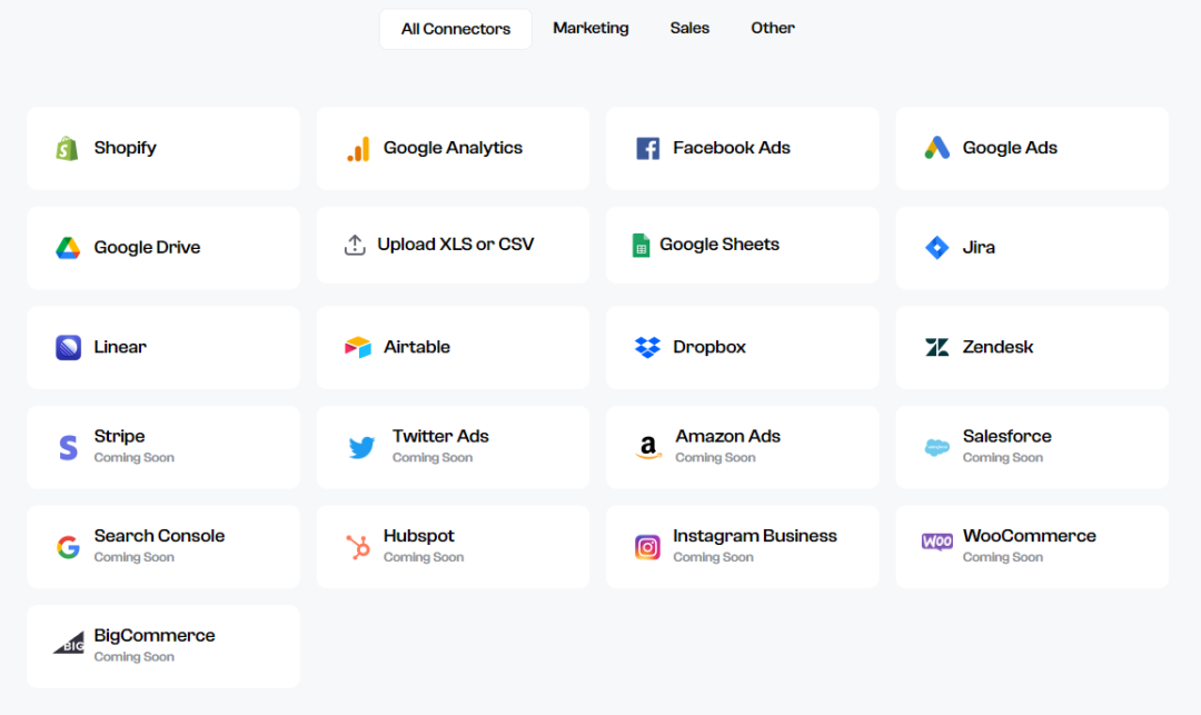它可以从多个常用的数据平台中自行获取数据,例如Facebook Ads数据平台、Google Ads数据平台、Shopify的数据平台、Google Analytics(这个也是我们的老朋友了)以及Google Sheets等中提取数据。你需要做的,是给这个工具连接这些数据平台的授权。除此之外,你不需要额外的数据操作技能。