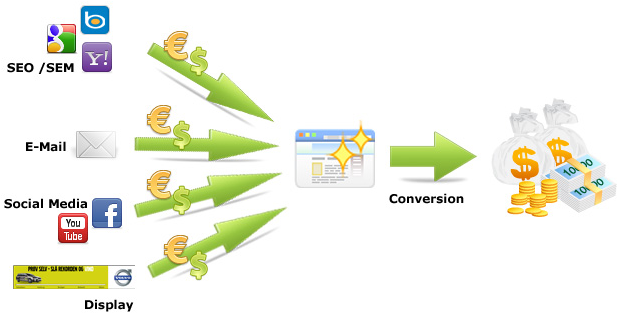 "一个进行在线业务的公司必然面对来自搜索引擎直接流量(通过SEO带来)、PPC流量、广告交换或者联盟流量、Affliate(联署营销)流量、EDM流量、直投显示广告、SMM流量(Social Media Marketing)流量、推介流量(referring sites带来)等重的一种或者数种,并必然要从策略角度衡量不同渠道的收益以权衡资源配置。"