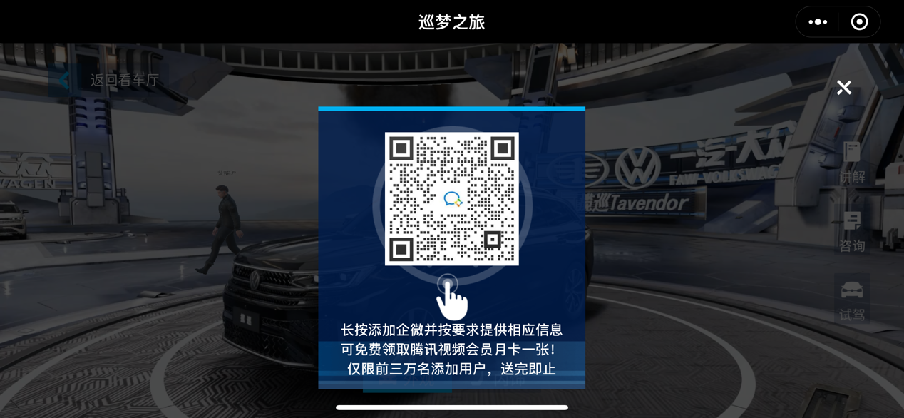 在整个发布会的现场,以及发布会结束后的小程序内,消费者也有大量入口可以加入一汽-大众的企业微信。企业微信可以一对一地解答消费者的问题,为消费者提供购买指导,或是干脆直接提供优惠信息。对于那些并不想留下电话号码,却仍然想进一步了解汽车情况的消费者,通过企业微信能够很好地实现更低“骚扰”的信息和服务的获取。