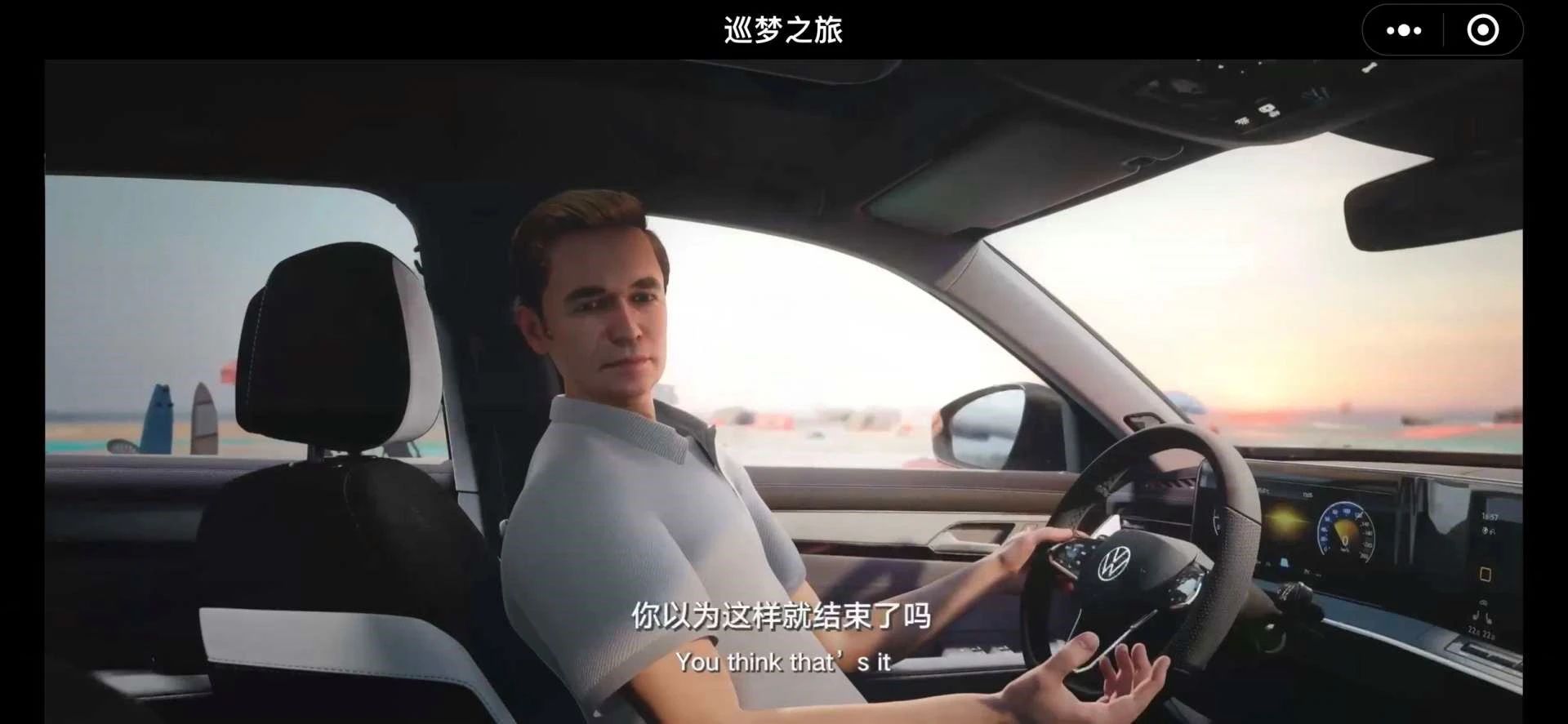 第二种,是在互动场景的情节进展中,有类似VR游戏中,可以自己操控的实景汽车乘坐感受。你可以坐在副驾驶上“左右张望”,看清车内的每个细节。同时,汽车的驾驶员——一汽-大众的工程师——将这辆车的各种特性向你娓娓道来。