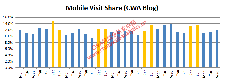 看起来同样有一个大致的三分之一左右的比例是来自于mobile的访问。那么,周末仍然比平日有更大的渗透率吗?