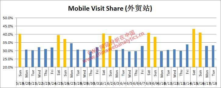 我手上日访问十万流量级别的电商网站,移动设备的访问量超过20%,并且也是周末高于平时,但不及国外网站高出那么大幅度。