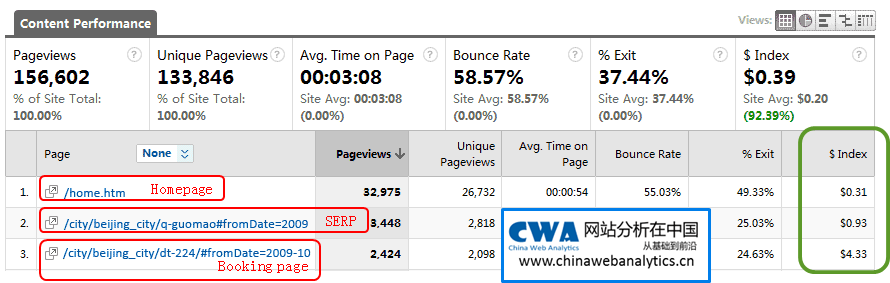 这难不倒我,对于做好了Google Analytics电子商务监测以及设置了漂亮的Goals和Steps的网站而言,一个工具就能解决问题——GA的$Index,这个度量(metric)用来衡量每个页面对转化的贡献。由于每个转化都意味着赚到了一定数量的钱,因此假如一个visit产生了一个10美元的转化,而这个visit一共浏览了10个页面才产生了这个转化,那么每个页面就平均为这个转化贡献了1美元,即对这个visit而言,页面的$Index=1美元。因此,如果某个页面的$Index很高,那么这个页面就是对转化至关重要的页面。