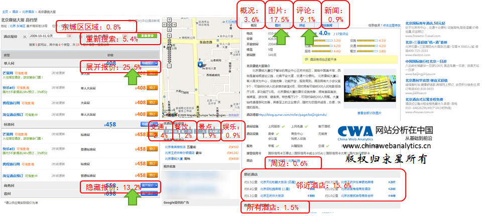 在这个点击热图报告中(左右两张图实际上是页面的上下两部分,因为原页面太长,所以我们把它切割为两张图),我们看到了一些明显的兴趣点——“展开报价”、“图片”、“邻近酒店”还有“隐藏报价”获得了比较多的点击量。有一点令人吃惊的是,“评论”并没有获得意想中的高关注。