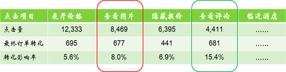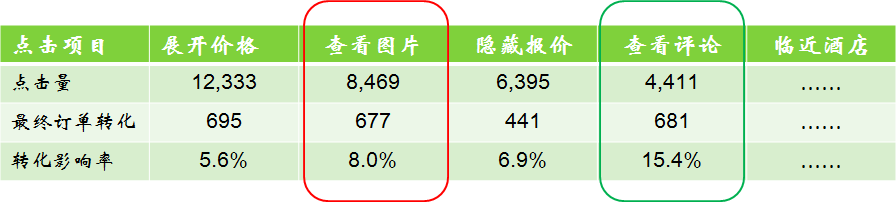 每一列都是某一个元素的点击量以及在这些点击之后发生的订单转化的对应数量。从上表中可以看到,如果用户发生了查看评论或是查看图片的行为,那么发生转化的几率要大于点击其他元素的用户。尤其是“查看评论”,它虽然没有获得很好的点击量,但却有最高的转化发生倾向。