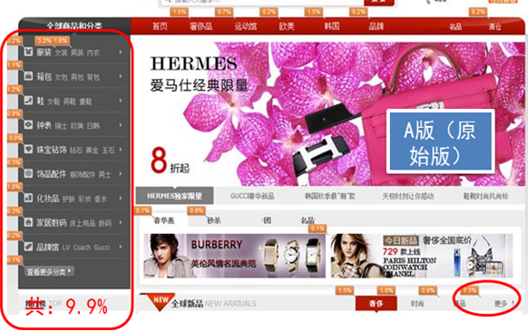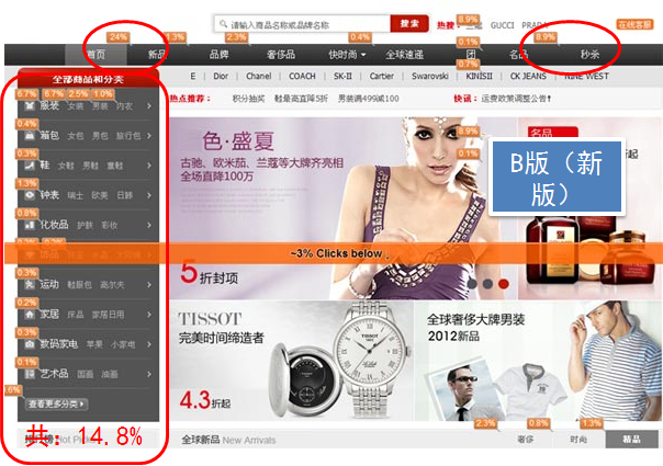 两个页面点击图的对比给我们很多信息,我们可以看到B版(新版)的首屏点击比例比A版(原版)更高,这说明新版在首屏的发挥上更见优势。新版的导航也获得了更多的点击比例,似乎源于B版分类调整的进一步合理性(这里我们只能猜测是这样,如果想要知道真正的原因,我们可以再专门为导航分类做一次AB测试)。新版值得注意的另一个特点是,在顶部大导航条上,“新品”获得了24%异乎寻常高的点击比例,而在旧版上,我们也注意到,底部“全球新品”栏目的“更多”也获得了7.3%的点击比例,显示了用户对于新品的浓厚兴趣。