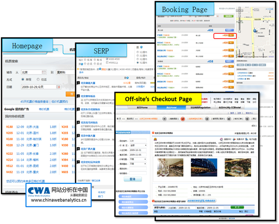 在2010年6月的某个闷热的夏天,我被一个问题困扰,这个问题是关于什么样的网站元素能够更有效的促进订单。这个网站是一个旅行类的网站,为用户提供在线酒店预定业务。这个网站有如下几种类型的页面,我的第一步工作是找到哪个页面对转化率的影响最大。