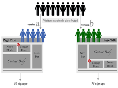 举一个网站分析常见的例子——我们现在觉得首页不那么好了,于是我们让设计部门设计了一个新的首页。新的首页看起来很不错,但我们不知道我们目前网站的用户是否喜欢它。于是我们做AB测试——我们把原来的首页(A页面)和新设计的首页(B页面)同时上线,我们的用户还是输入以前网站的域名,所有的流量渠道也仍然都指向以前的首页(A页面)。但奇妙的是,尽管所有的流量都是进入的A页面,但一部分的用户(一般都是一半的用户)看到的并不是A页面,而是B页面,并且他们将一直看到B页面,而另外一部分用户则还是一直看到A页面,直到测试结束。这部分看到B页面的用户使我们专门选出来的吗?完全不是,他们是完全随机被分配到B页面的。