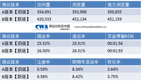 从数据结果上看,即使是差异较大的购物车添加率和转化率,实际上也并没有显著的差异。在某些指标上,旧版本甚至要更好一些,例如bounce rate和exit rate,而在电子商务转化率上,新版又要比旧版更好一些。这些数据并没有反映二者的差异,或者说宏观对比分析并没有给我们什么很给力的结论。