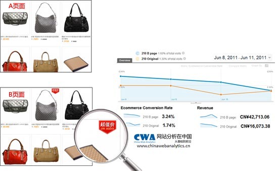 这个测试显示了非基础驱动因素的优化对于短期营销活动效果的重大影响。部分商品被标以“超值价”之后,经过B页面的流量的转化率发生了明显的增长,产生的销售也超过两倍的提升。