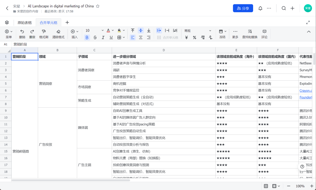 然后是各阶段的主要领域(营销课题),以及其下的子领域(营销课题下要解决的具体问题或者具体的应用方),再之后则是进一步的细分领域(具体AI的应用功能)。