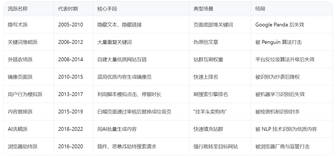 规模化方法五花八门,黑帽SEO因此也分出了众多流派,每一个流派都曾空前成功,然后慢慢又被搜索引擎发现、反制、惩罚,最终有的方法不再使用,有的则不敢越雷池半步,变成白帽SEO的一些优化策略。