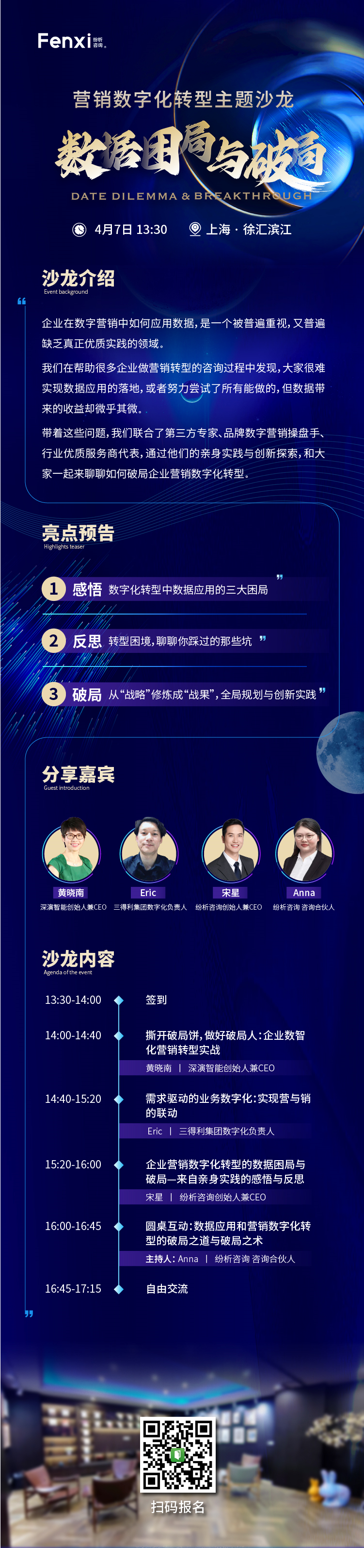 本次沙龙活动,会有三位嘉宾给大家进行分享,分别来自甲方的经验丰富的从业者(食品快消行业的数字化转型负责人)、第三方专家(纷析咨询的创始人),以及行业中提供多年相关服务的同样经验丰富的服务商代表(深演智能的创始人)。