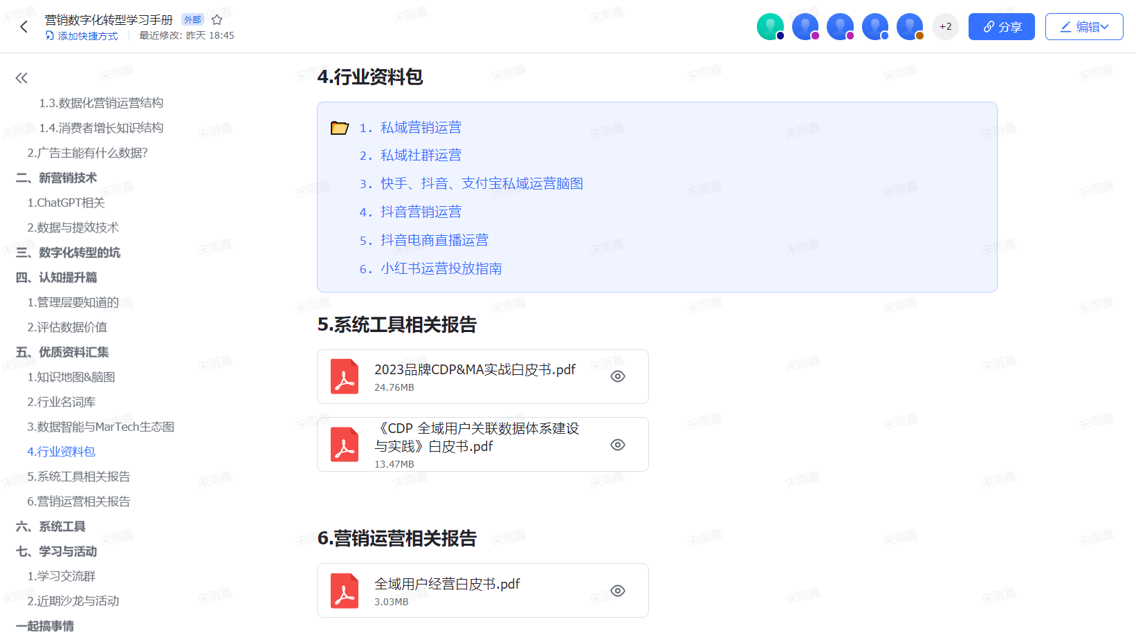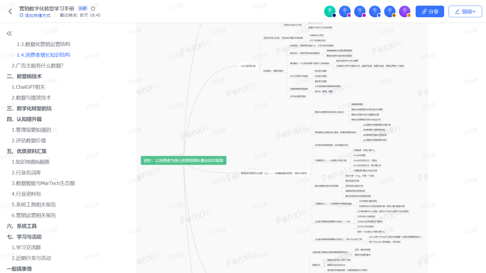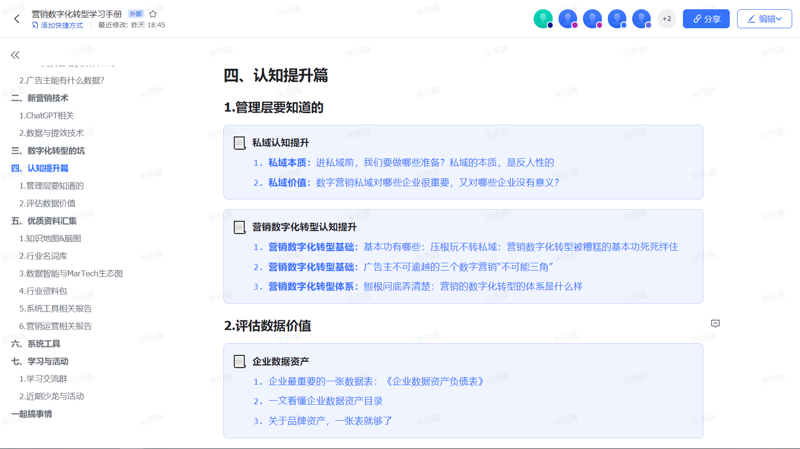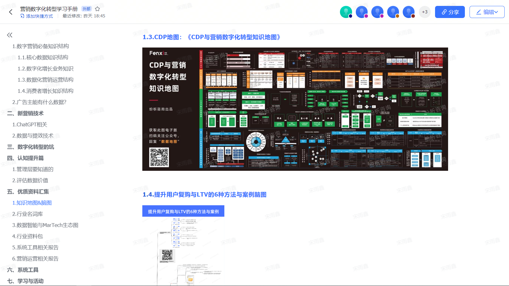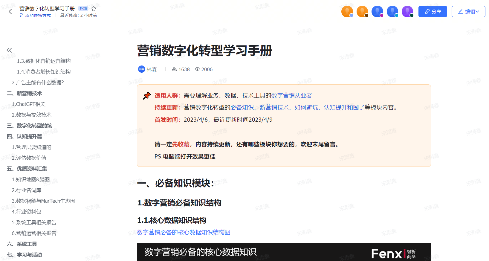 今天跟大家分享一个好东西——《营销数字化转型学习手册》。这是一个在线共享的文档,特点是体系化且持续更新,也就是说,这个文档内容不但包含营销数字化转型中最核心的知识,也会随着行业的变化而更新。所以请一定先收藏好。