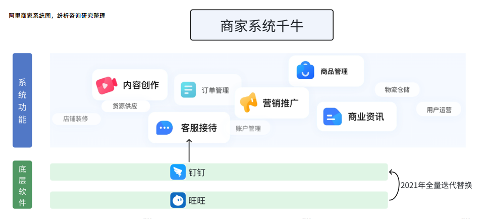 我们再往下看看客服系统的底层软件,以往是采用旺旺作为消息底座,但是在2021年,阿里将整个集团的消息底座全量切换成了钉钉,以支撑阿里内部、小二与商家以及商家与消费者之间的沟通。