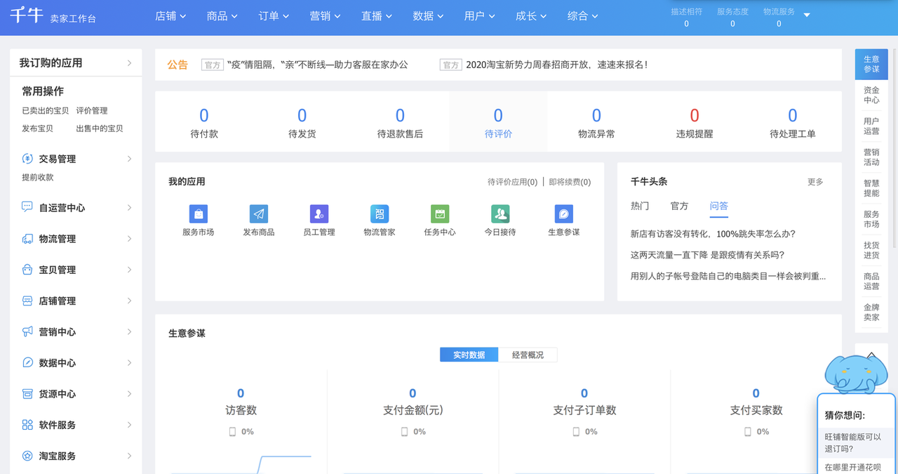 我们先来看看货架电商淘宝的客服系统架构。淘宝的商家客服体系是打包在商家系统千牛之中的,千牛的定位是一站式商家工作台,打通了阿里系所有卖家产品,功能比较庞杂,包含商品管理、物流管理、店铺管理以及客服接待等多个模块。