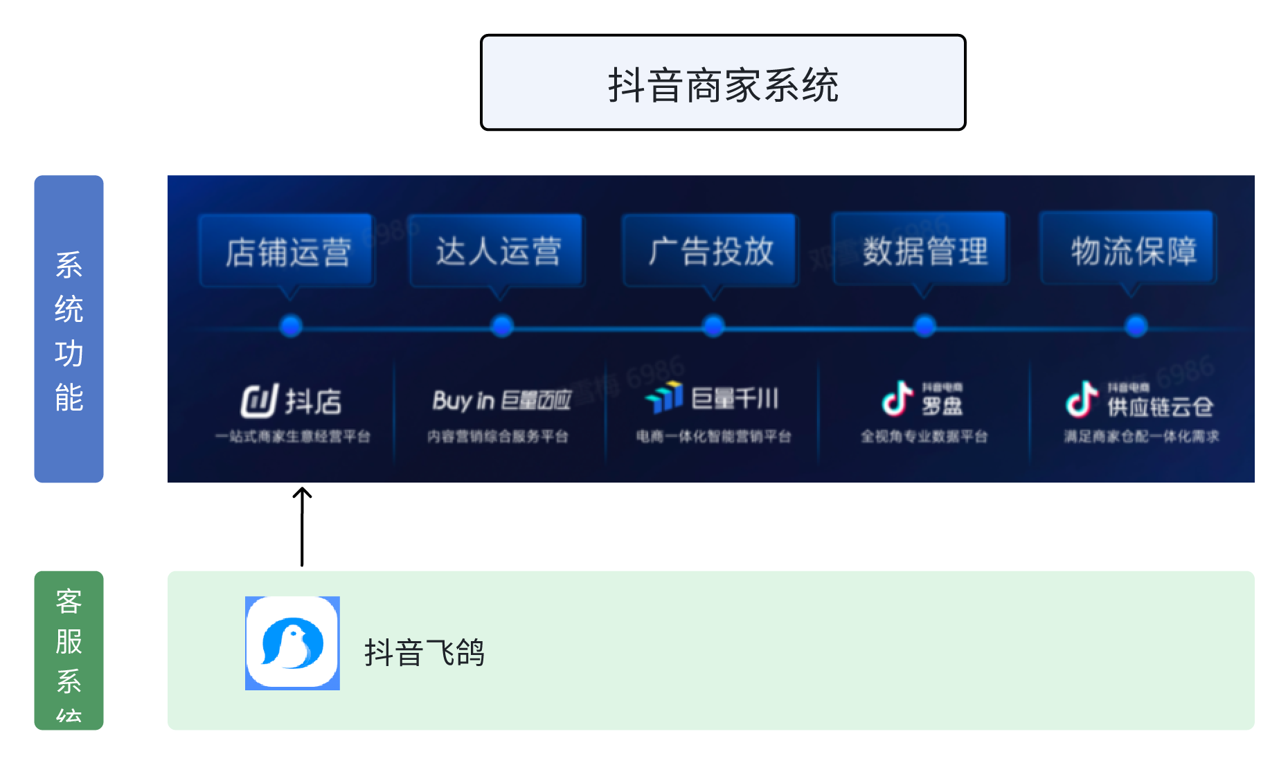 不过,抖音做了改造,它不像阿里将所有功能收敛于一个千牛系统之中,抖音的商家提效产品还是以一个个独立的产品形式存在,而客服系统“飞鸽”则是放在了抖店平台之下。