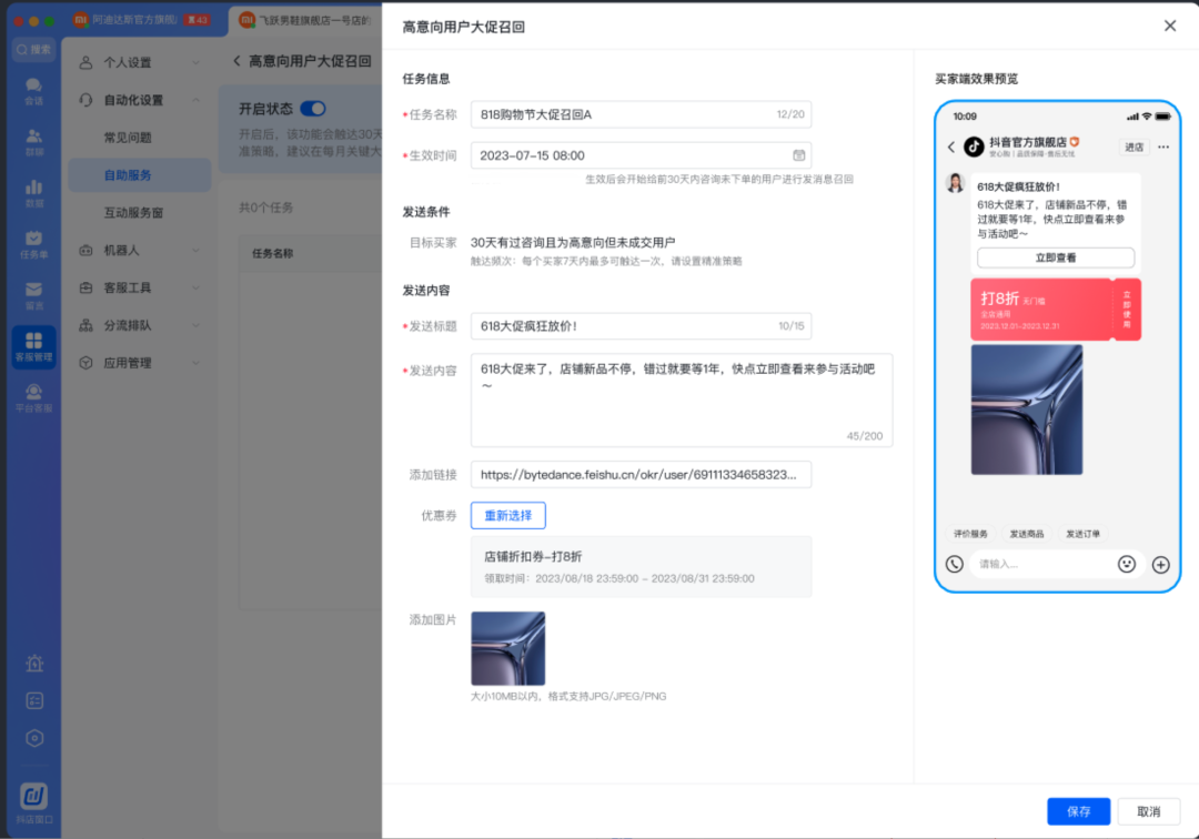 今年8月,抖音飞鸽上线了一个新功能——“高意向用户大促召回”,这是一款帮助商家在大促期间,向流失的意向用户发送定向营销信息的导购工具,仅针对店铺过去30天有过咨询,且为高意向但未成交的用户。官方测试宣称,该工具的召回成功率可达8~10%,但真实的效果如何还有待商家的反馈。