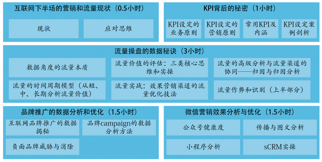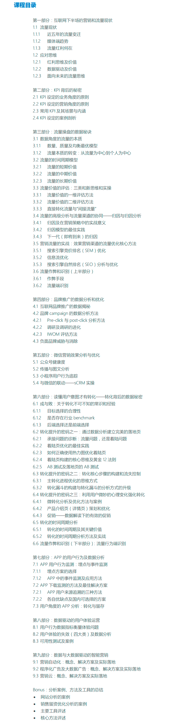 1.营销:流量背后的数据智慧、投放背后的数据策略、营销背后的数据价值。在课程中,不仅有有宏观角度的数据解读,更有很多微观角度的通过数据进行的价值判断,以及全篇皆是如何将数据的呈现与实际业务相结合。这一点与之前课程的设定是一致的,区别在于新课程更偏重解决新时代中新场景中的新问题。