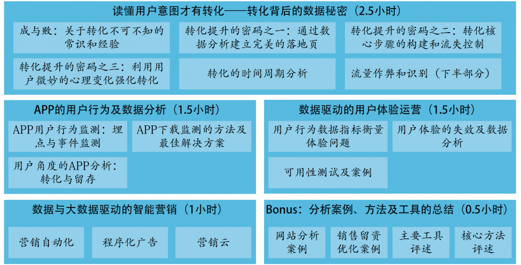 与之前的七次课程相比,这次课程想要解决的核心问题并没有发生变化,全部内容仍然聚焦于如何利用数据(主要是小数据而非大数据,个人觉得大数据目前在营销上的应用还不成熟,更不落地)促进现有互联网营销和运营水平的提升。但内容有大量的升级优化。