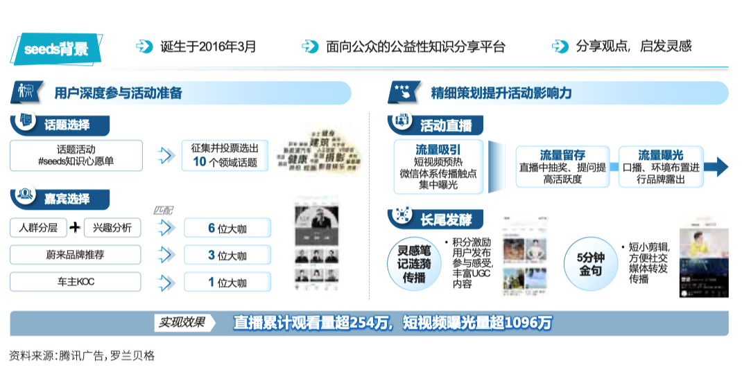 为了更加清晰地听到用户的“心声”,蔚来结合原创的知识分享平台seeds,在社区内收集用户诉求,提供有价值的内容,与用户一起成长。2022年,蔚来通过seeds 与视频号知识专栏,携手10 位大咖,打造“知识开年,以新知启发新灵感”系列分享活动。蔚来在APP 中发起“#seeds 知识心愿单”话题活动,征集用户最感兴趣的话题,同时结合用户投票、兴趣洞察,匹配了杨澜、邓亚萍、吴晓波等六位垂直话题大咖以及多位蔚来推荐嘉宾和车主KOC,结合高质量的视频号传播 ,完成了品牌价值传递与社交媒体裂变,用事件营销、跨界合作推动私域裂变。