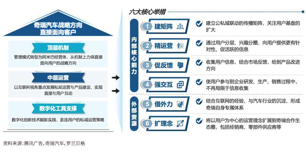 以更互联网的视角,奇瑞通过六大核心举措重点发展私域产品建设与私域运营,实现直接向客户传递信息,直接与客户互动。