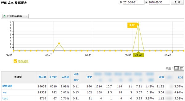 另外,这个工具也提供了ROI分析,即投入的广告和最终的产出。这个工具似能支持在线营销本身的成本,例如对搜索营销CPC的记录(但没有了解具体是什么原理,不知道是否要做专门的上传),而通过自己的设定,也能够定义每个电话的价值几何,这个功能与Google Analytics中自己设定达成每个goal所代表的货币价值是类似的。虽然不能够直接捕捉到每个电话带来的purchase的价值,但是自定义的方式仍然有意义,原因在于通过估算后的每个电话的平均价值回报,能够近似代表它们带来的实际收入,毕竟生意是你自己的,你一定能够清楚每个电话背后意味着多少钱。下图是ROI数据界面。