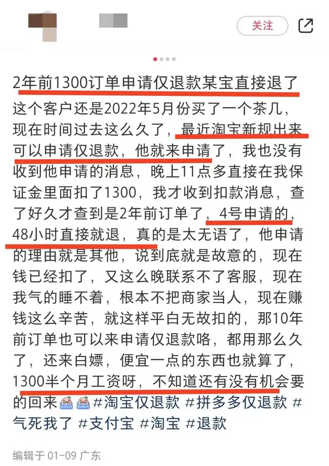 有商家说,他们遇到了有买家把三个月前确认收货的订单翻出来,找到瑕疵,然后要求仅退款,然后还成功了。仅退款最夸张的记录,据称是两年前的订单,1300元,也被直接薅了羊毛,见下图: