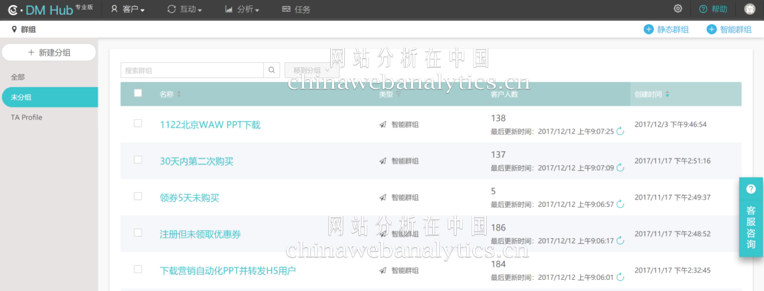 静态分组是指选择了某一类或者几类用户进行营销,比如某时段查看过某页面的用户有1000人,那么就固定对这1000人进行营销。
