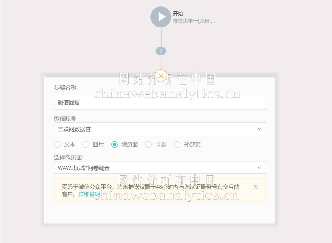 以下两张图片是我们的“互联网数据官”微信公众号的例子:对于下载过WAW沙龙PPT的用户回复一个问卷调查微页面(系统生成的H5)。第一步是图4将下载过沙龙北京站的用户进行分组;第二步如图5中设定回复规则,当用户下载完PPT后系统随即给用户推送问卷如图6。