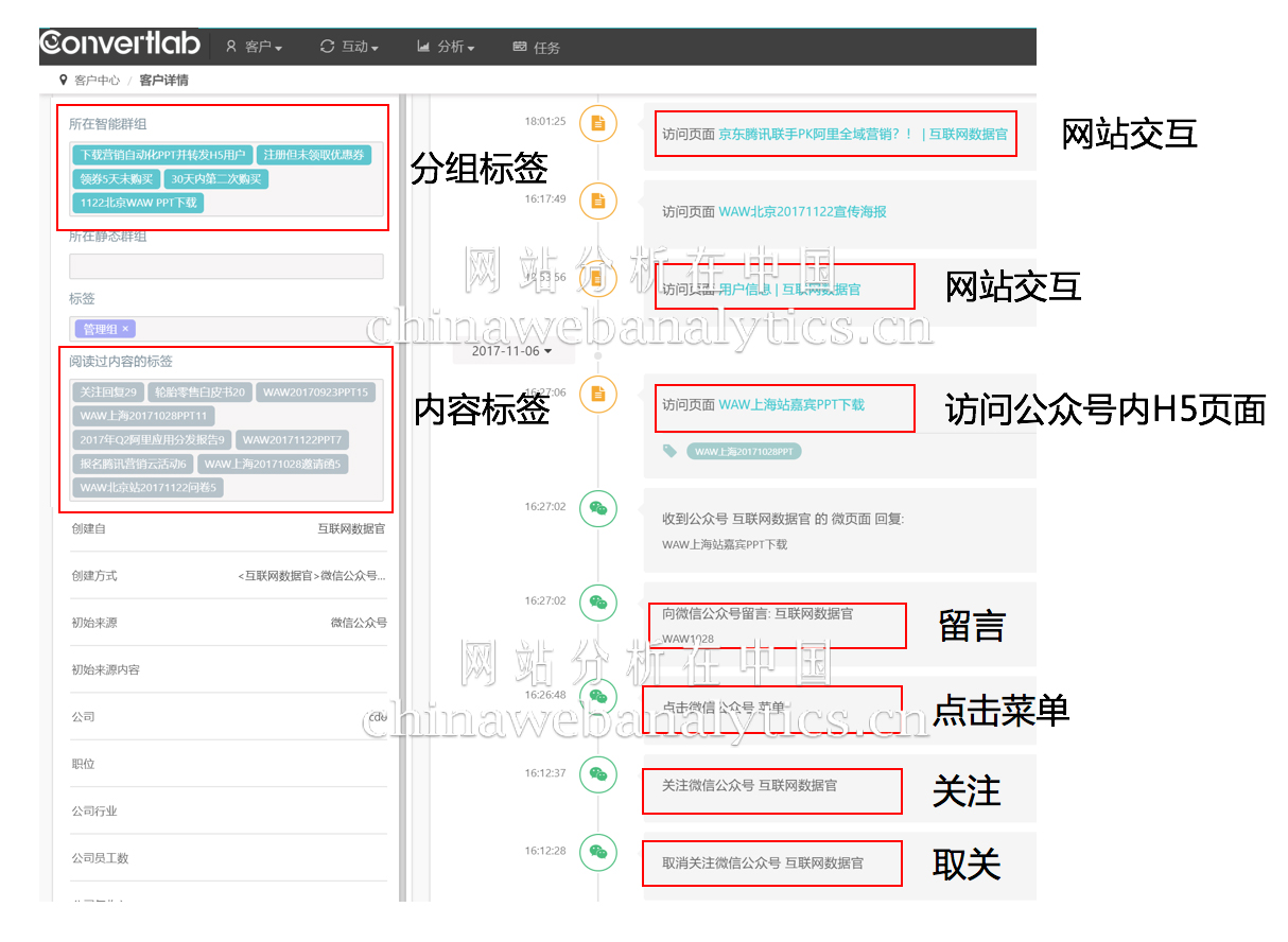 行为数据:菜单栏交互、页面阅读转发、填写表单、关注取关、留言等,这里说的不是单纯的交互数量,而是各用户具体与哪些菜单栏交互、转发哪个页面、填写什么表单、何时取关等具体的用户行为细节。