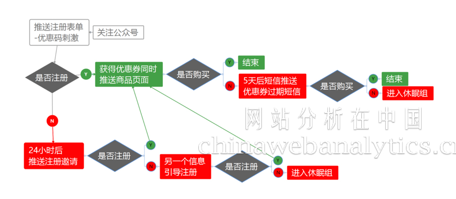 比如,下面的流程,是我们按照人们的注册和购买行为来进行分组,营销执行则按照预定的流程“行进”——对不同类型及不同阶段的人群,给予不同的营销刺激。