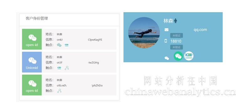 其实,既然你可以在微信公众号的H5页面上抓取用户数据,那你当然也可以在自己的其他网站(比如自己的官网)上抓取用户数据——就是典型的网站分析罢了。而且,一旦你能够让用户在你其他的网站上注册、登录或者提交手机号码、email,你就能通过这二者将你自己网站的用户行为数据与微信公众号内H5页面上的用户交互数据打通(当然,前提是你也让用户在H5上完成注册或者登录)。再加上微信公众号的交互数据与公众号H5上的用户行为数据也是打通的(因为OpenID和用户email或者手机号码都在微信环境中被你同时获取,就是前面重复两遍所强调的),所以,你实际上就实现了将(1)自己的网站、(2)微信公众号用户互动、(3)微信公众号上H5页面的用户互动三者数据打通。
