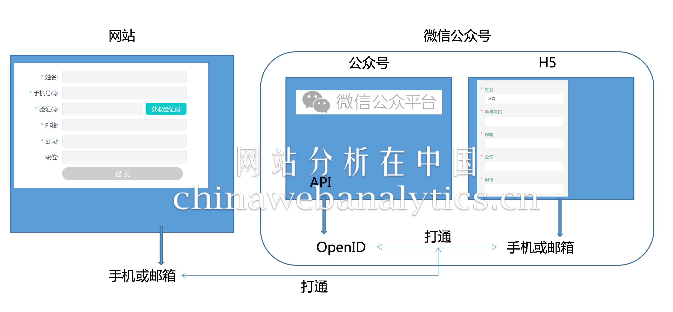在获取上面的第一小类和第二小类数据的同时,由于环境都是在微信中,你顺手就能将用户的openID和用户的email或手机号码打通。前面已经讲过,这里再重复一下。