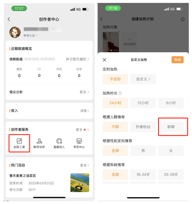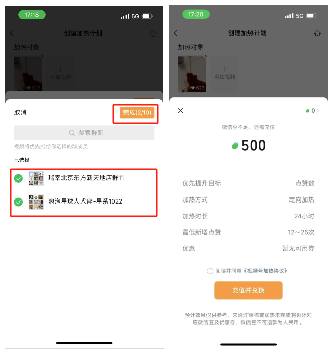 我们都知道,微信豆加热功能可以提升视频号短视频或直播的曝光度、互动量和粉丝增长,基本功能类似dou+。但微信豆还有一个隐藏功能,能帮你拦截竞品或同行的精准流量。操作也很简单,以短视频加热为例,进入个人主页-创作者中心-加热工具。选择要加热的视频,在自定义加热的人群推荐里,选择【群聊】,可以把你加入过的社群(不一定是你创建的)勾选起来,下单。系统就会把你的短视频推送到群成员以及很它相似的用户面前。