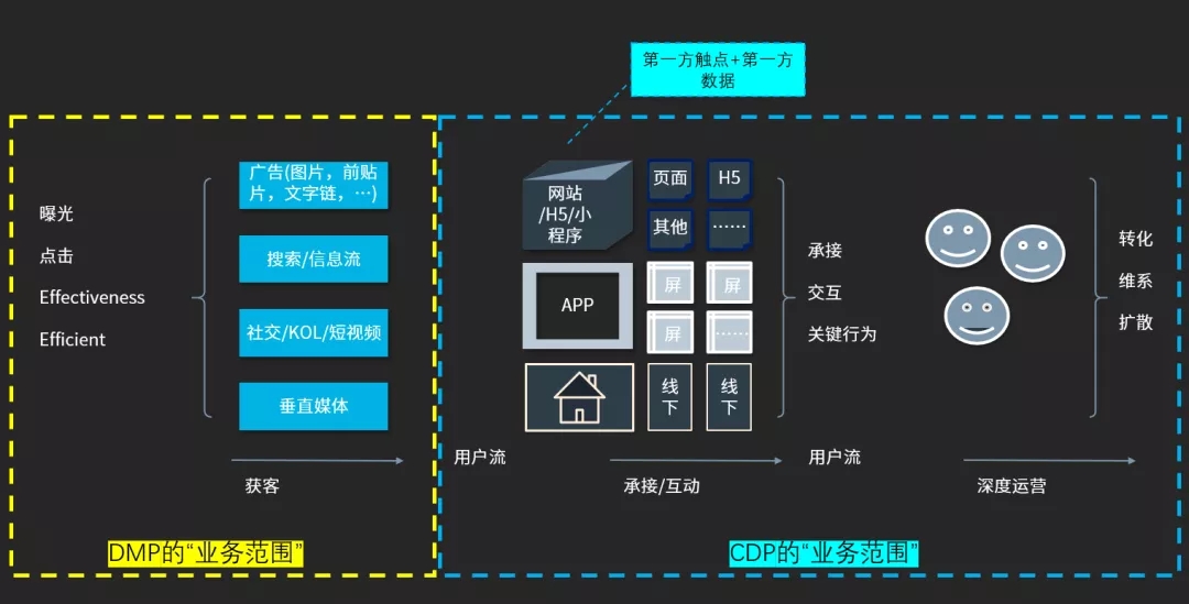 广告主获取了这些数据,应该如何存放,又应该如何应用这些数据呢?CDP和DMP主要的广告主应用数据的工具,前者主要解决广告主的第一方数据的获取、管理和应用;后者则主要解决企业从外部引入的数据的管理与应用。