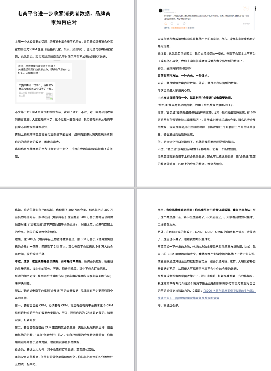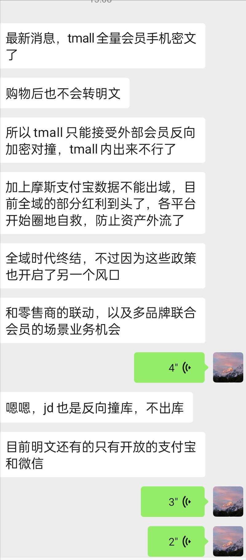 天猫不再给“口子”,包括 ISV 第三方也没有这个口子了(密文解密不了了)。想拿天猫的会员数据,自己得首先要有该会员在自己的 CRM 中。所以,自己的会员私域更重要了。另外还有三个信息点: