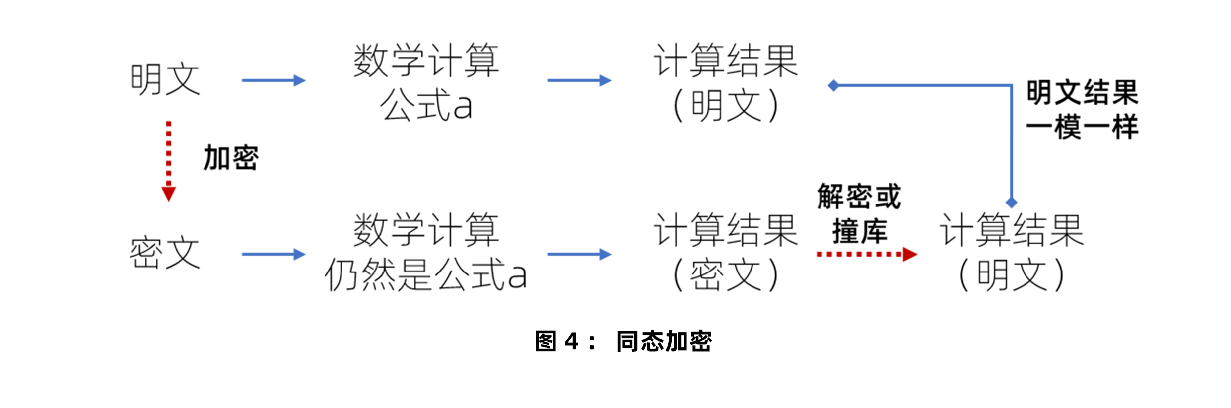 你肯定又有问题了,为什么C计算的是媒体B发来的加密的个体属性。加密之后,还能计算吗?答案是,能。因为隐私计算有另外一个技术,叫“同态加密”。所谓同态加密,就是计算原文(明文)的结果,和计算这些明文加密之后的密文的结果,是完全一样的。如果原文用了某个算法和秘钥进行了加密,那么加密之后,做“加减乘除”以及各种各样的数学计算之后得到的结果,再利用该加密算法和秘钥解密之后,得到的结果,和直接用明文做同样的数学计算得到的结果一样。