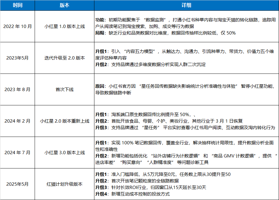 小红星早在2022年10月就已经上线过。从它的更新迭代的历史可以看出本次红猫计划中,它最大的更新,一个是降低了准入门槛,商家0元起投;另一个是数据监测的维度更细了,可以到单篇笔记。