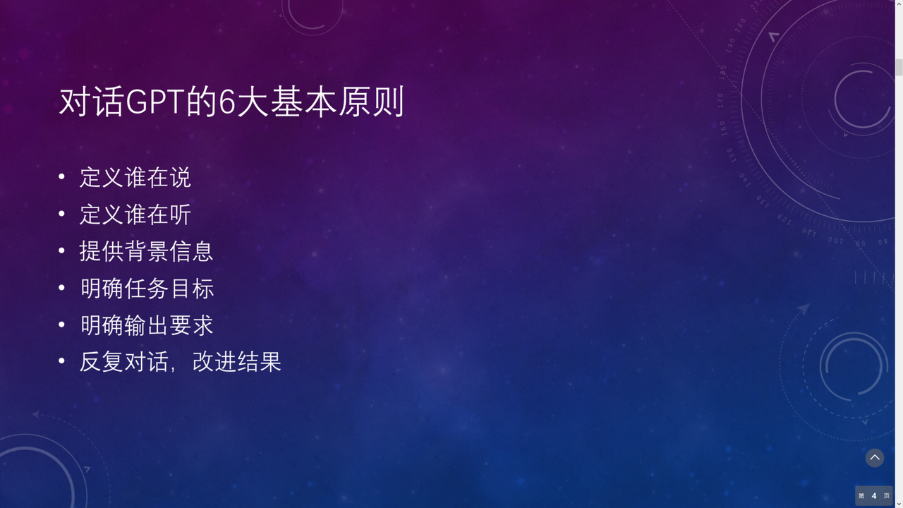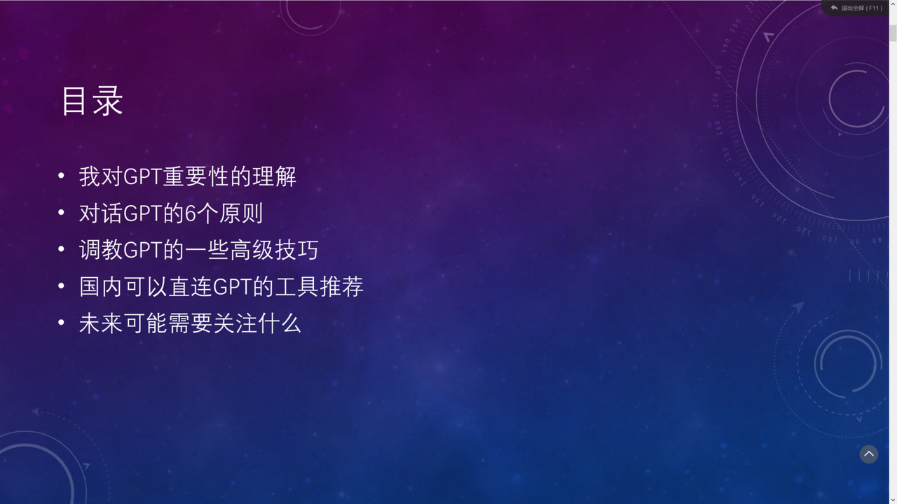 第二位是孙维老师分享的《用好GPT的6个原则和高级技巧》,内容包含使用GPT的6个原则 、调教GPT的一些高级技巧、国内可以直连GPT的工具推荐以及未来可能需要关注的地方,这些内容都是孙维老师从自己实践中总结出来的经验,非常落地。