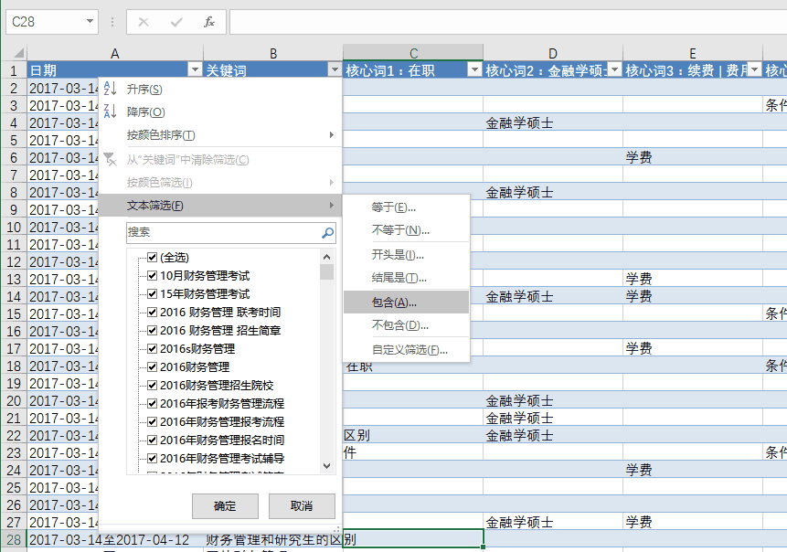 没关系,我们有Excel,利用Excel的表格工具,再利用“文本筛选 -> 包含 ”,可以轻松把相关的词根筛选出来,如下图所示。例如,我想找到词根为“在职”的核心词,在“文本筛选 -> 包含 ”中输入“在职”,然后新建一列“核心词1:在职”,把所有筛选出来的结果对应的C列,填入“在职”。