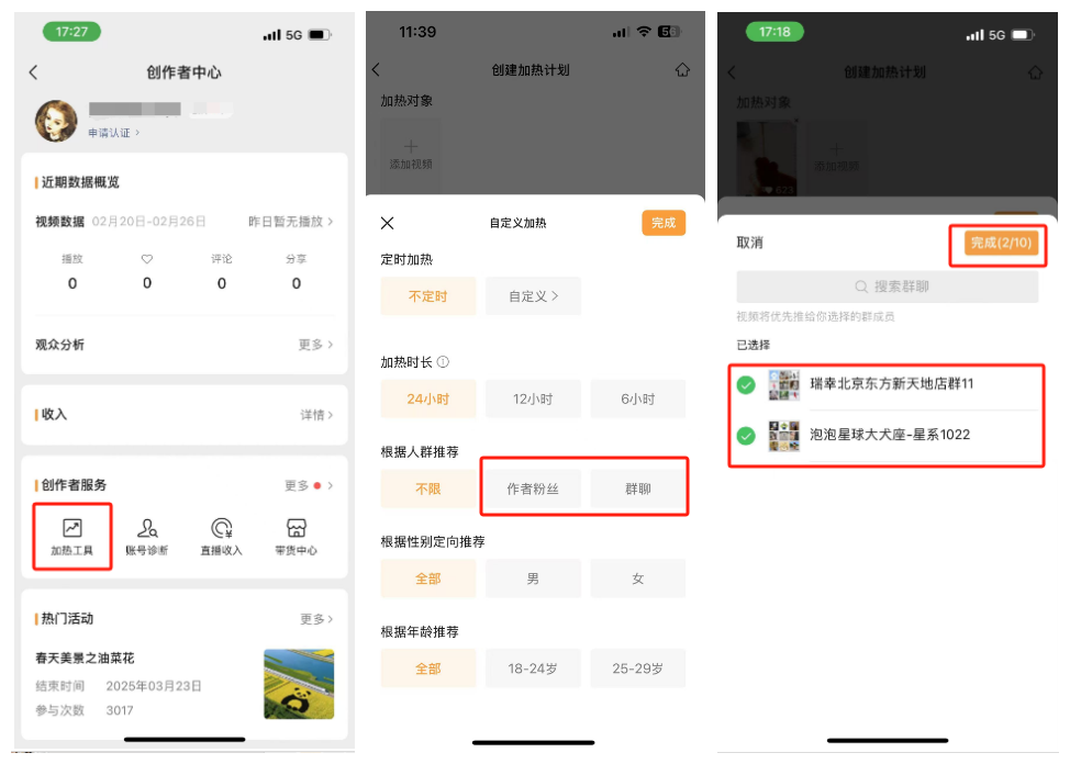 - 进入自定义加热方案,勾选 “根据作者粉丝推荐人群” 或 “根据群聊推荐人群”;