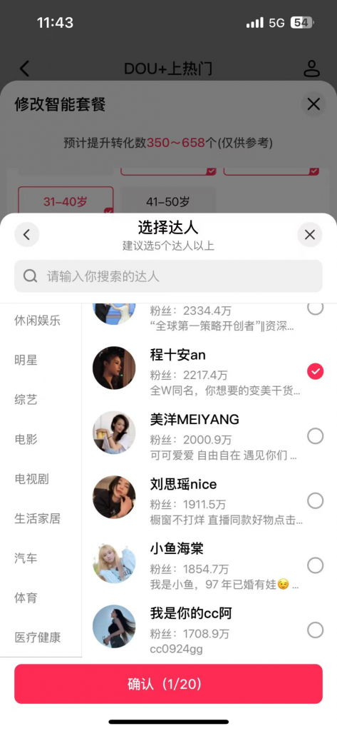 选择“达人相似”投放模式,圈选和你赛道一致的同行达人。比如你做美妆就选美妆博主,做家居就选家居达人,系统会自动把你的视频推给这些达人的粉丝,以及行为、兴趣相似的精准人群。相当于直接共享同行的用户池,截流效率比盲目投放高 10 倍。