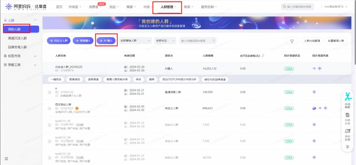 在达摩盘的人群管理里找到我的人群,点击AI圈人。