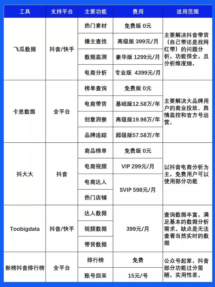 本次,为大家介绍市面上比较成熟的几款短视频数据分析工具。大家可以根据自己的需求,选择最适合自己的工具。整体情况如下所示: