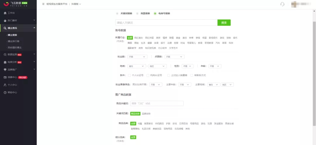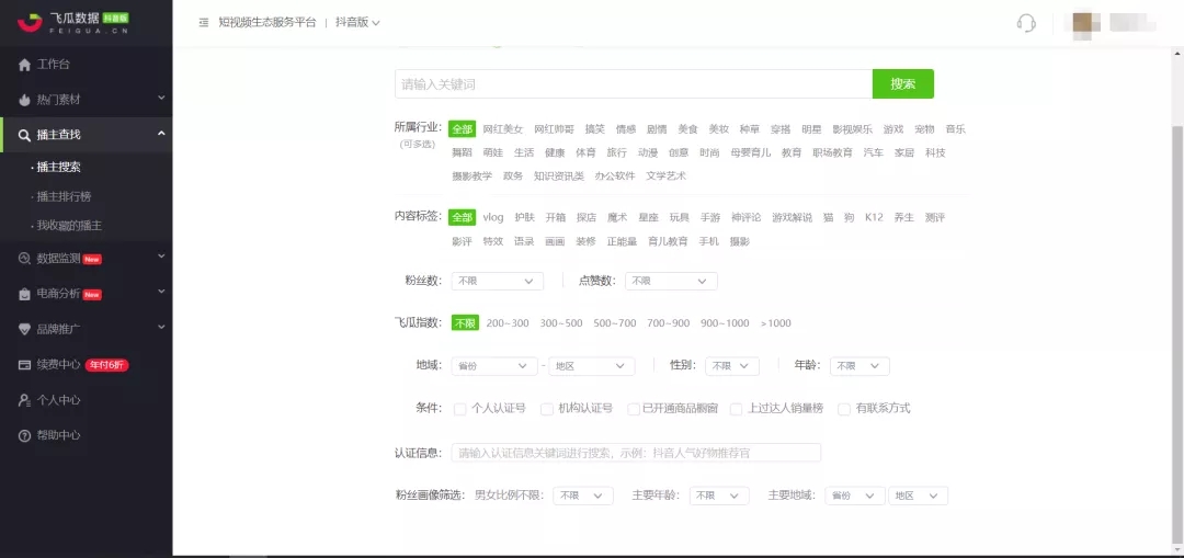 如果广告主对自己的推广要求有明确的认知,可以通过飞瓜数据的播主搜索,设置条件:行业、粉丝属性、粉丝数量等来寻找达人。